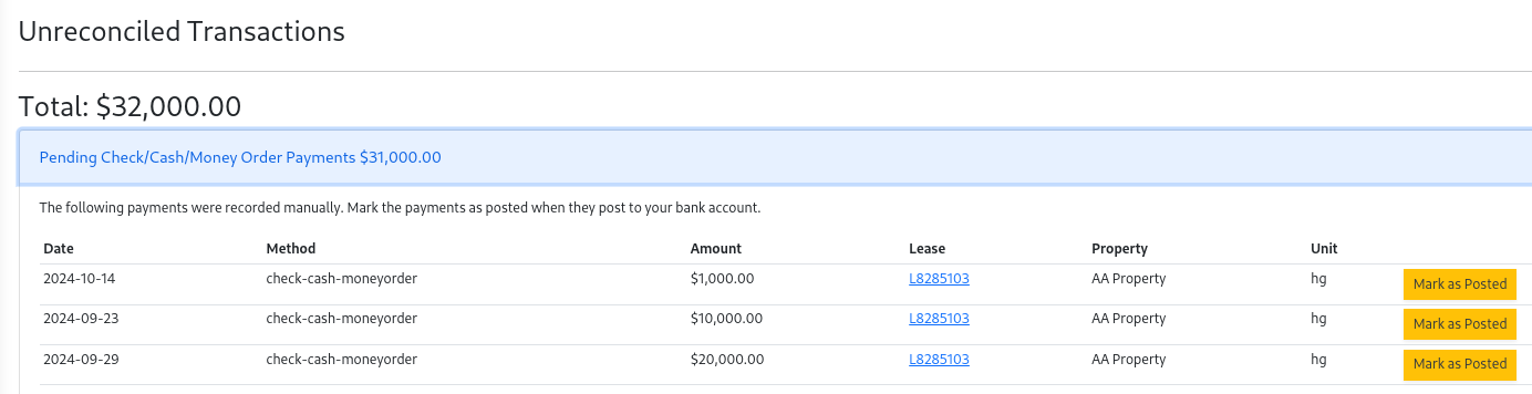 Pending Check/Cash/Money Orderlist selectMark as Postedfor the payment.