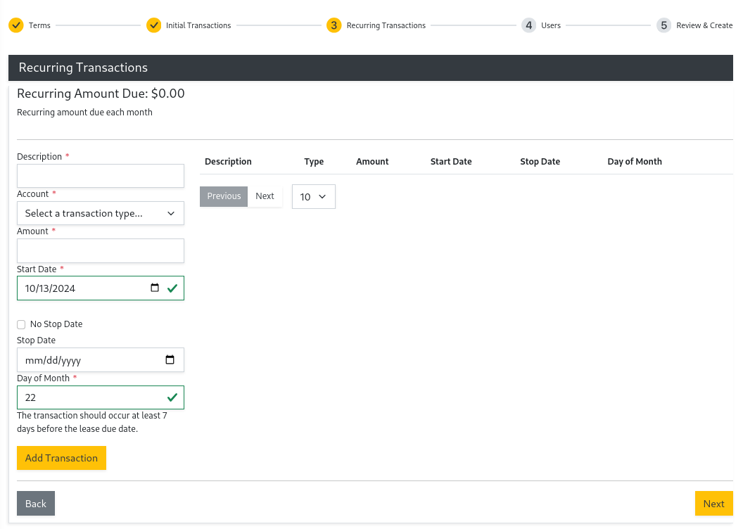 Start Date,Due Date, andEnd Date, or checkMonth to Monthif there is no End Date. You can also add the automatic late fee configuration on this page. Then clickNext.