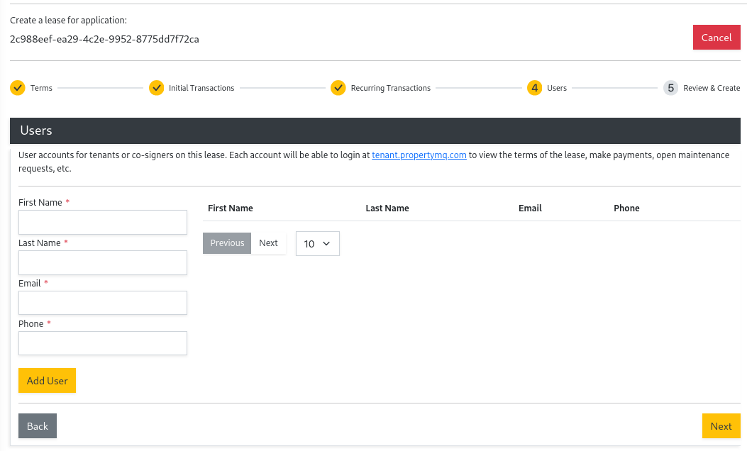 - (Optional) Add any users that will need access to the tenant portal by filling out the details below and clicking