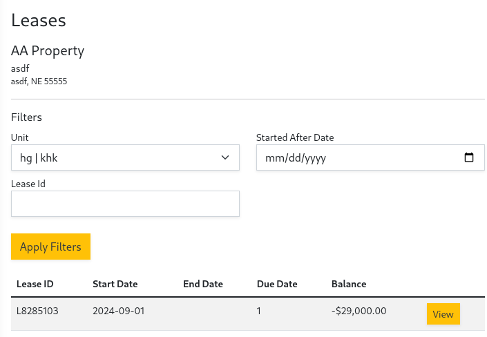 CustomersselectLeasesin the left navigation panel - Use the filters to find the lease by the Unit name. Once you find the lease, select