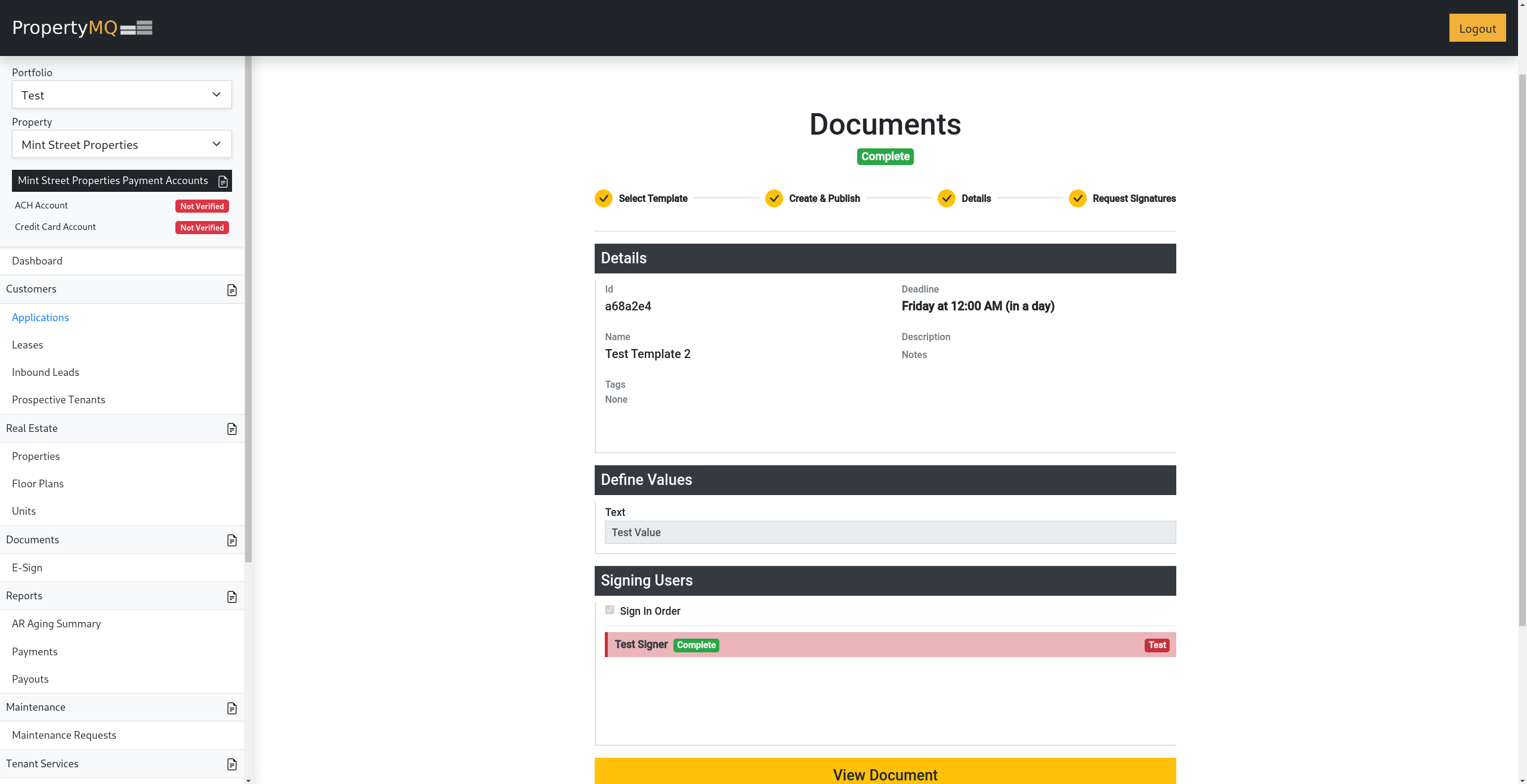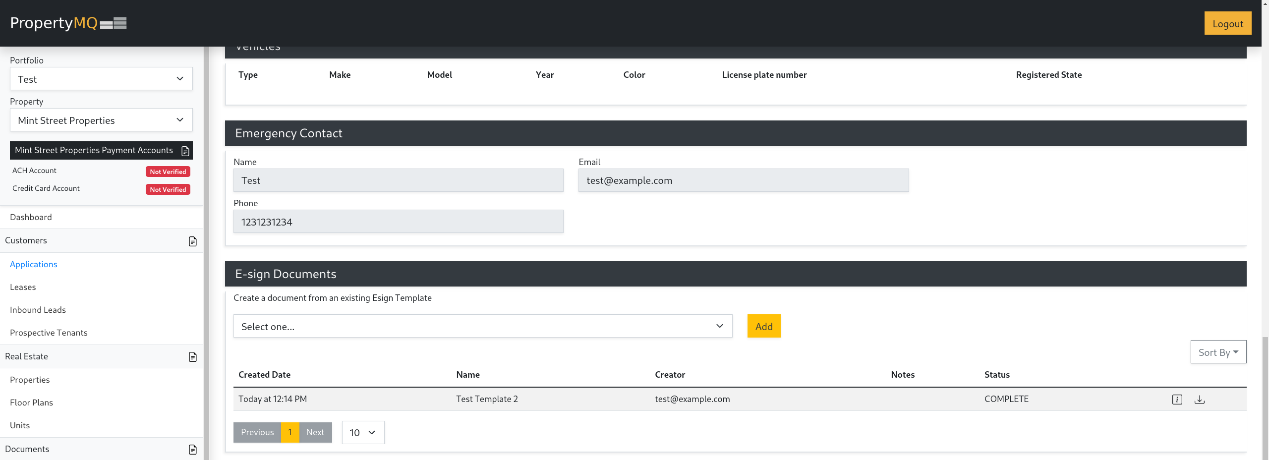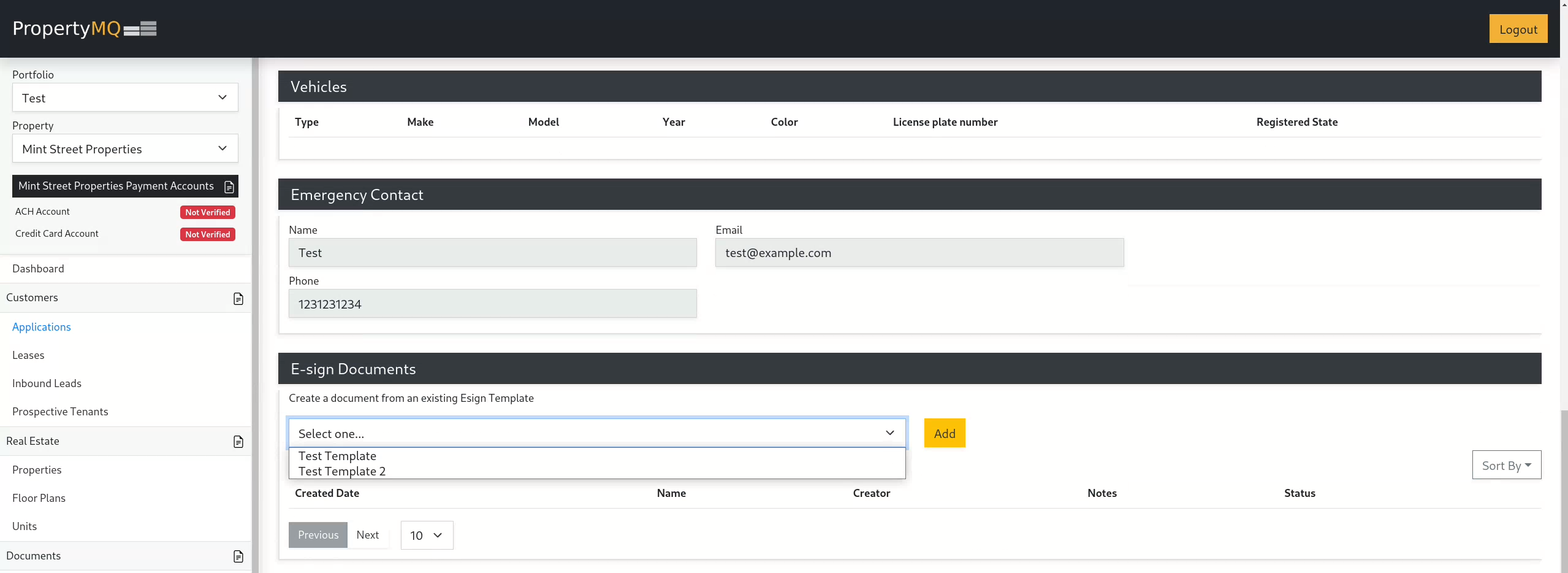 In the E-sign Documents section, there will be a dropdown menu that includes all the Published templates associated with the selected Property similar to the image below.
