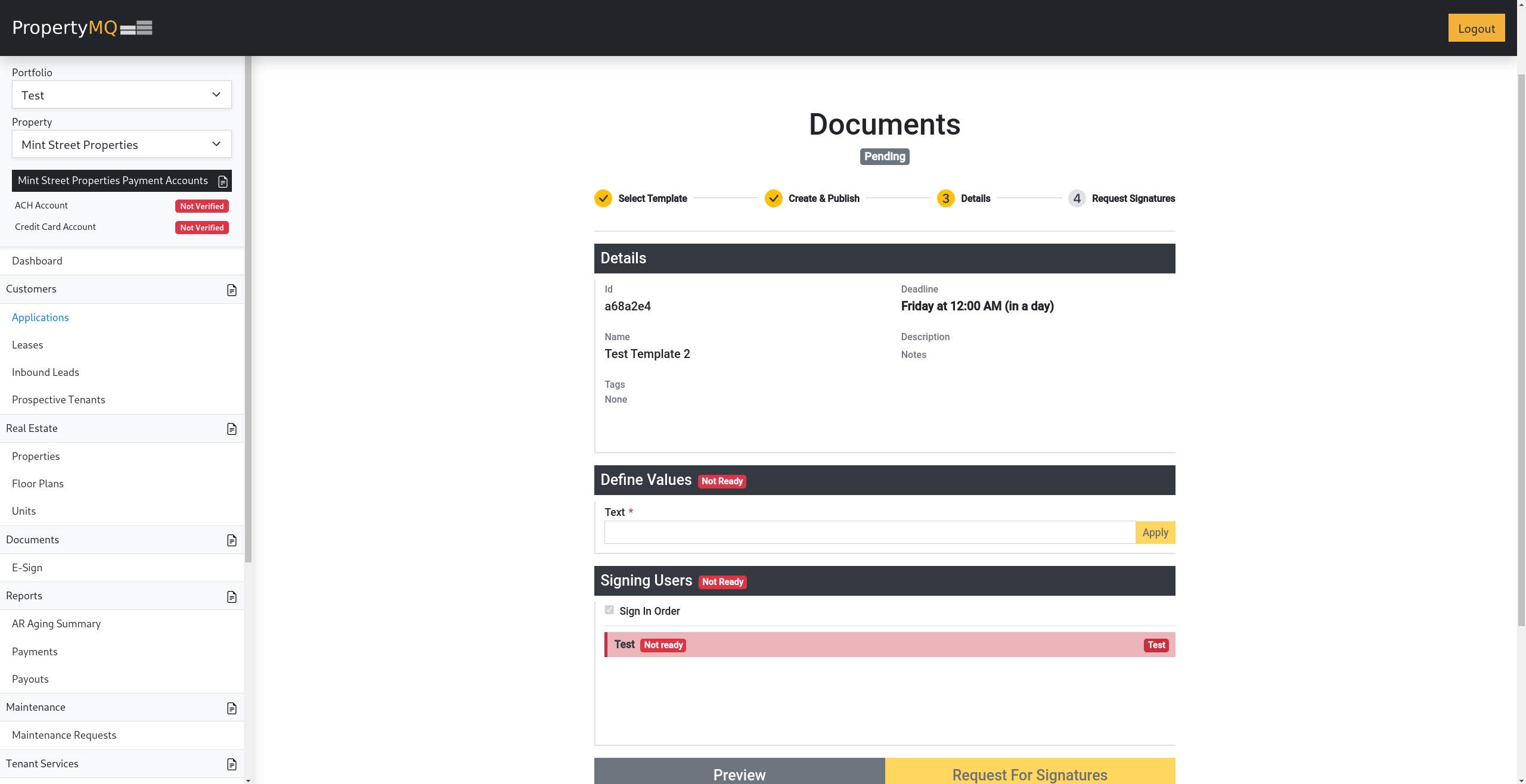 The Request For Signatures button will remain disabled until all sections are marked Ready as shown above. This will happen when all, if any, values in the Define Values section are set and all signing users in the Signing Users section are configured and saved.