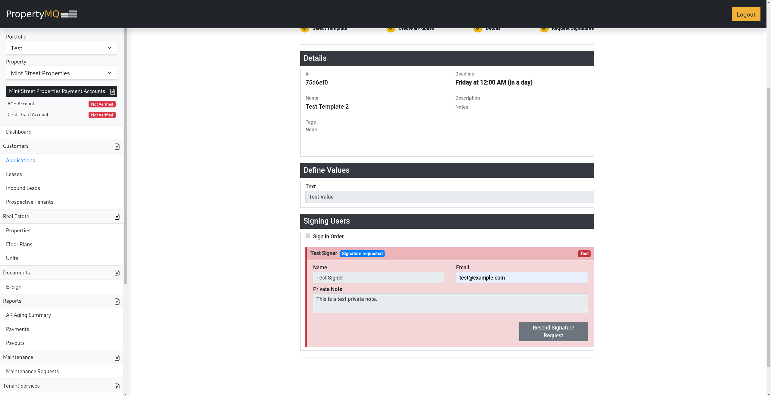 Once a signing user has been sent a signature request, there will be a Resend Signature Request button that appears in the dropdown of that signing user as shown above. When clicked, this will resend a signature request email to that signing user.