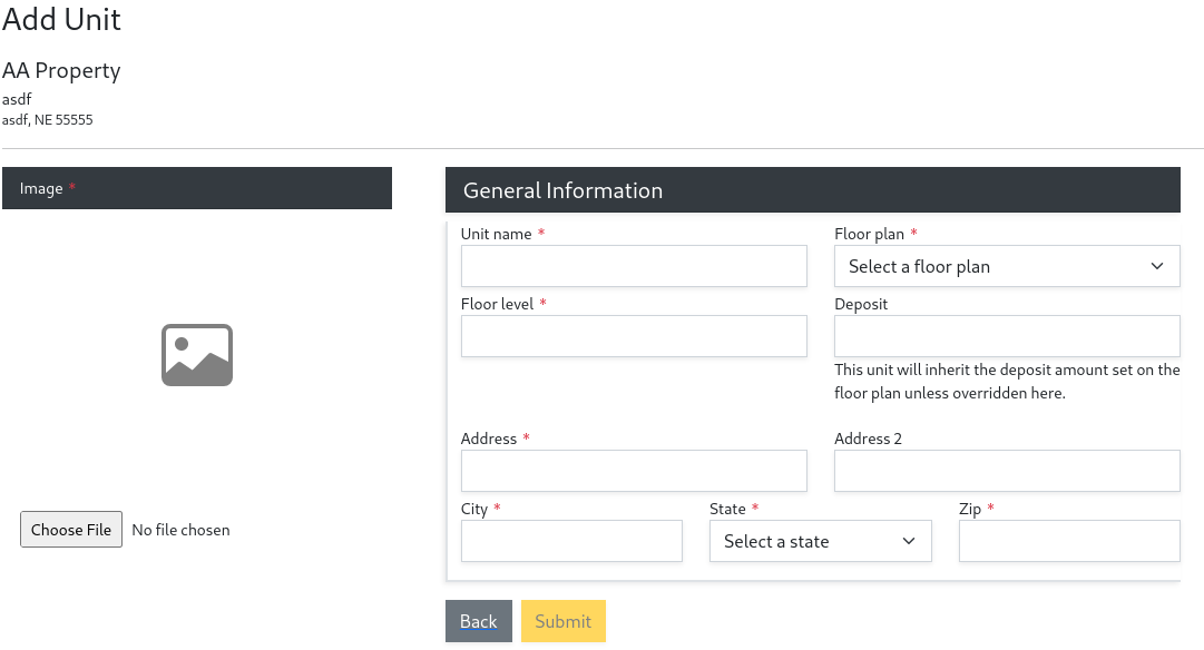 Select Submit to save the unit. After submitting you will then have the option to set default terms and services for the unit. This is only needed if you use the Tenant Application feature to accept applications.